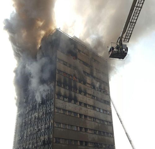 حفاظ جان پناه ته سالن تکه تکه میافتاد و از طبقات سر میخورد و میرفت پایین. فریادهای گنگ و محو کاسبها و آتش نشانها در فضا با دود مخلوط بود. دستور خروج و اعلام خطر از هر طرف میرسید. همه مشغول و موندگار بودن اما به بقیه توصیه میکردن که خارج بشن!!